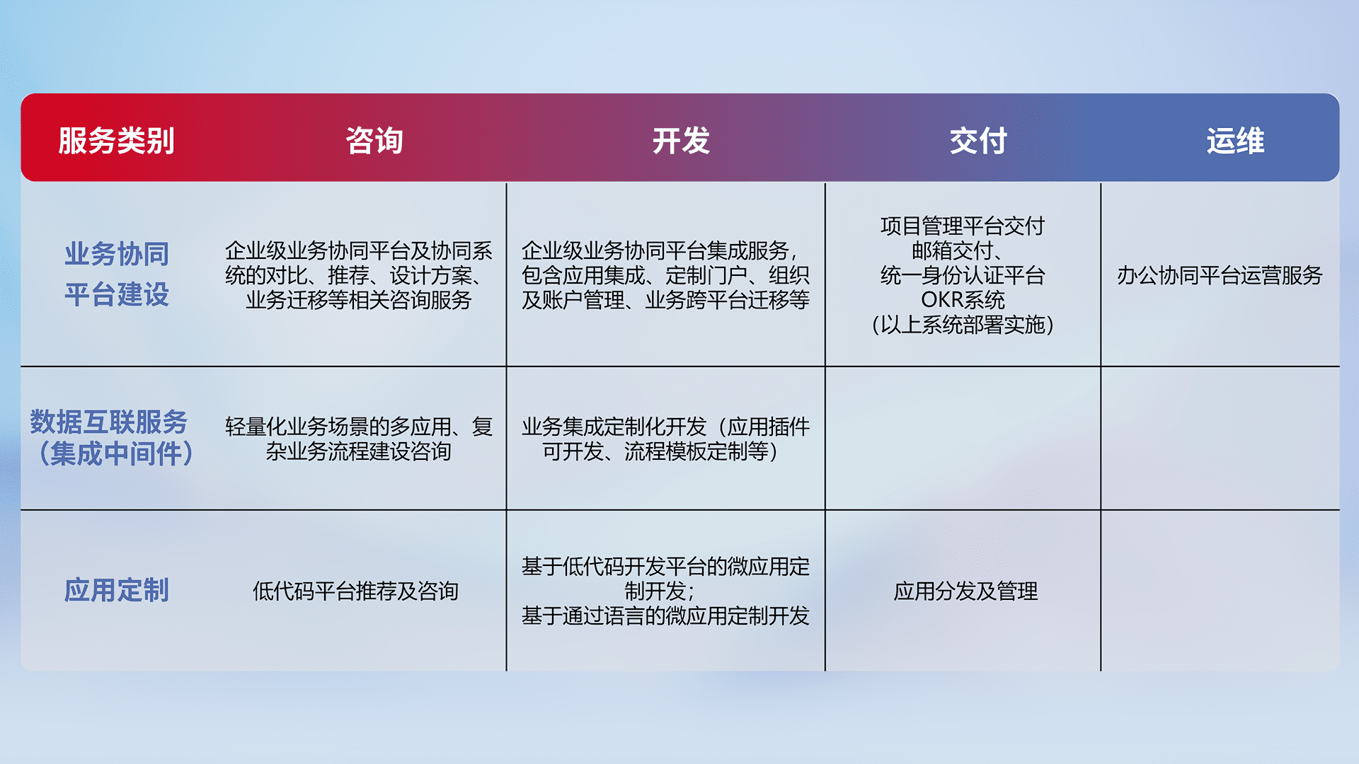 针对钉钉、、企微、、、IDaas等平台级产品提供产品的规划、、、方案、、、、交付、、、定制化开发等服务,,,实现如统一协同办公、、智能客户服务、、、混合会议管理、、、智能数据查询、、等业务场景,,,实现数字化转型。。。。