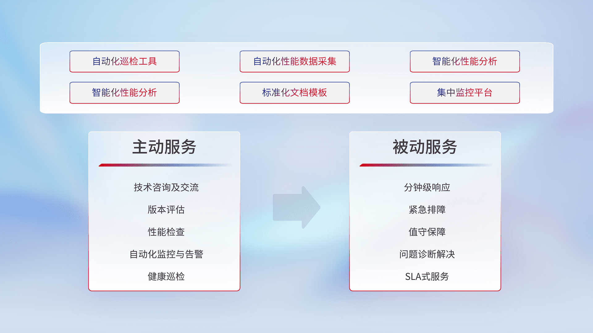 智能化工具和标准化文档,,,,保障服务质量,,,提供主动服务(包含技术咨询、、、、版本评估、、、、性能检查、、自动化监控与告警、、、、健康巡检)和被动服务包含(分钟级响应、、、紧急排障、、值守保障、、、问题诊断解决、、、SLA服务)。。。